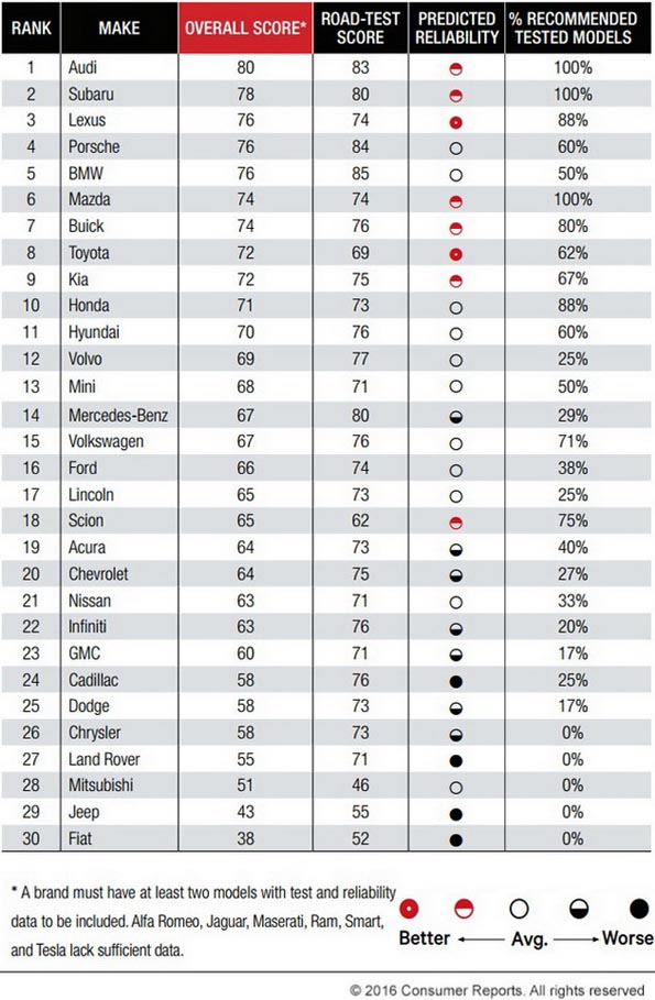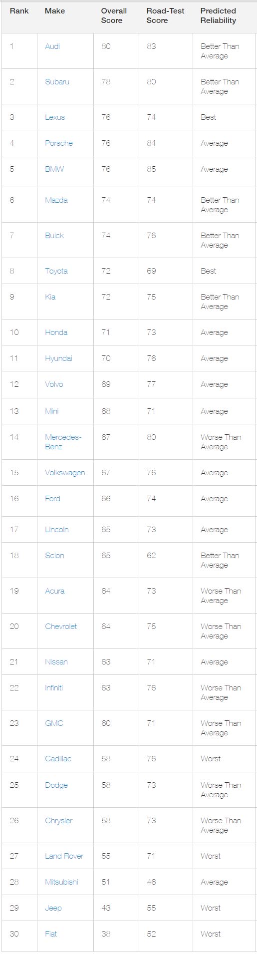 Στην πρώτη θέση της κατάταξης βρέθηκε η Audi, με συνολικό σκορ 80 βαθμών και αξιοπιστία πάνω από το μέσο όρο. Μεταξύ των 30 μακρών αυτοκινήτων η BMW κέρδισε τους περισσότερους βαθμούς (85 β.) στο Road Test και τους λιγότερους η Mitsubishi (42). Πιο αξιόπιστες μάρκες αναδείχτηκαν οι Lexus και Toyota και χειρότερες οι Fiat, Land Rover, Cadillac και Jeep.