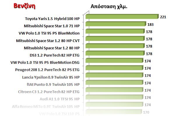 Τις απαντήσεις θα τις βρείτε αναλυτικά στους παρακάτω πίνακες, όπου παρουσιάζουμε τις μεικτές καταναλώσεις όλων των μικρών αυτοκινήτων βενζίνης και πετρελαίου και με βάση αυτές πόσα χιλιόμετρα μπορούν να διανύσουν θεωρητικά, με 10 ευρώ για καύσιμα. Να σημειώσουμε ότι οι όλες καταναλώσεις που αναφέρονται είναι εργοστασιακές και οι αποστάσεις υπολογισμένες με βάση τις προαναφερθέντες μέσες τιμές βενζίνης και πετρελαίου. Σε πραγματικές όμως συνθήκες, η κατανάλωση είναι περίπου κατά 2 λτ./100 χλμ. πιο πάνω από τις εργοστασιακές.