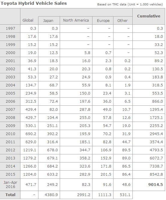 Η Toyota ανακοίνωσε ότι οι πωλήσεις των υβριδικών αυτοκινήτων της ξεπέρασαν παγκοσμίως τα 9 εκατομμύρια από τον Αύγουστο του 1997 που λανσαρίστηκε το πρώτο το μοντέλο Coaster Hybrid EV, ενώ ακολούθησε τον Οκτώβριο του ίδιου έτους το Prius.