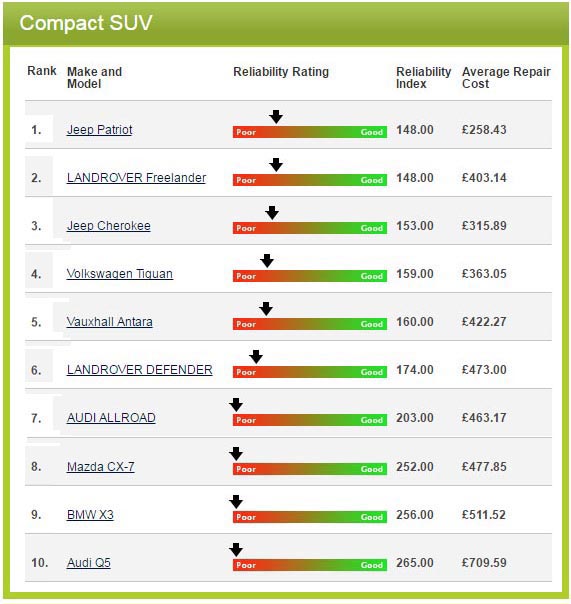 Στην συγκεκριμένη περίπτωση εξετάζουμε ποια είναι τα 10 λιγότερο αξιόπιστα μικρομεσαία – μεσαία SUV, από τα 32 συνολικά μοντέλα που περιλαμβάνει η κατάταξη του Βρετανικού Reliability Index με τις χιλιάδες αναφορές. Να σημειώσουμε ότι ο μέσος όρος του «Reliability Index» είναι το 100 και στην τελευταία θέση της κατάταξης της κατηγορίας τοποθετείται το Q5 με 265. Εκτός από τα ποσοστά εμφάνισης των προβλημάτων (βλ. παρακάτω πίνακες), υπολογίζεται ακόμα το μέσο κόστος ανά ζημιά και η μέρες που μένει στο συνεργείο, ο αριθμός των βλαβών, ο μέσος όρος της ηλικίας και των χιλιομέτρων κ.λπ.