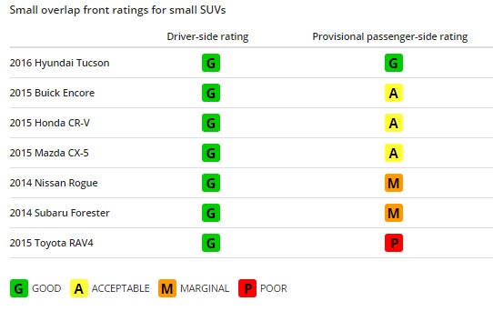 Όπως θα δείτε και στον παρακάτω πίνακα, τα περισσότερα SUV (πλην του Hyundai Tucson) που δοκιμάστηκαν προσφέρουν λιγότερη ασφάλεια από την πλευρά του συνοδηγού στις δοκιμές μετωπικής πρόσκρουσης μικρής επιφάνειας κάλυψης. Πιο τρανταχτό παράδειγμα αφορά το RAV4, το οποίο πέρασε επιτυχώς το εν λόγω crash test από την πλευρά του οδηγού, όμως το ίδιο τεστ που έγινε από την πλευρά του συνοδηγού έδειξε σημαντικά χαμηλότερα επίπεδα ασφάλειας.
