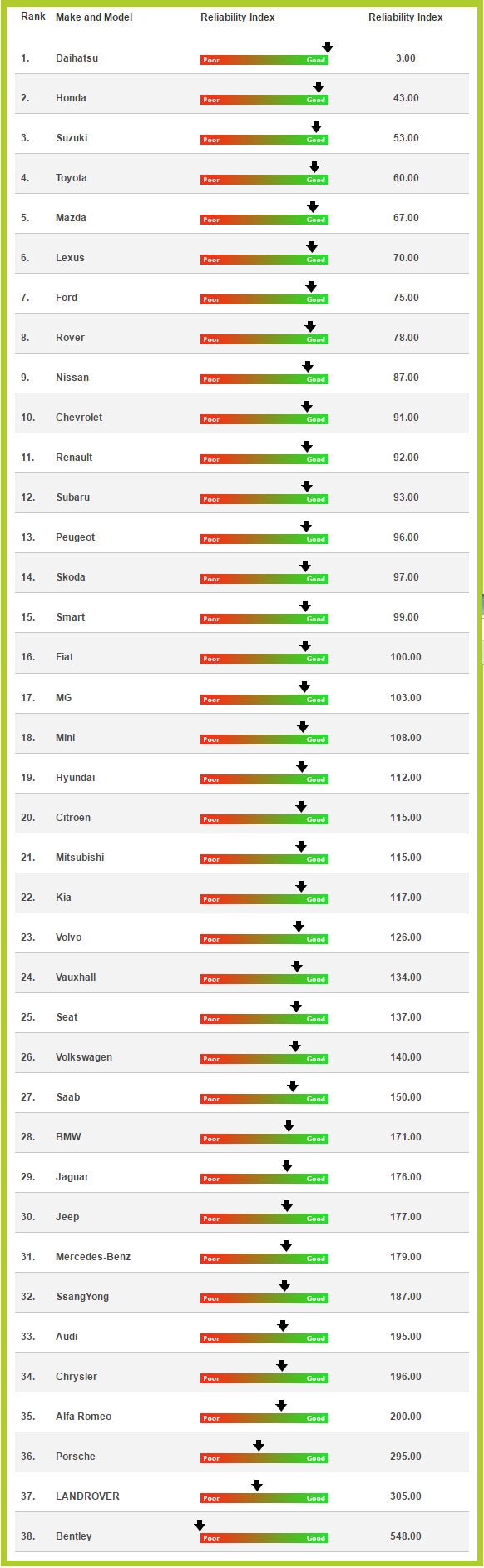 Μία ακόμα εταιρεία που εξετάζει την αξιοπιστία των αυτοκινήτων, είναι η Reliability Index από τη Μ. Βρετανία, η οποία ανανεώνει συνεχώς την βάση δεδομένων της (πάνω από 50.000 αναφορές). Μέσος όρος στην συνολικής κατάταξης μεταξύ των 38 μαρκών που ανακοινώνει είναι το 100.