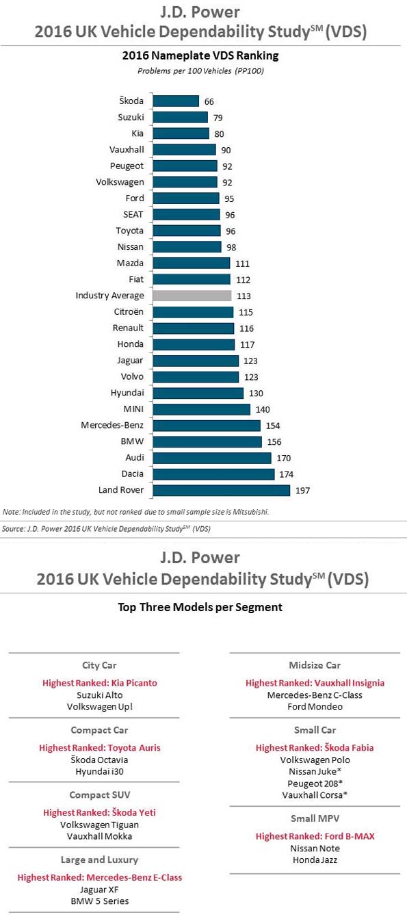 Η J.D. Power μετρά τα προβλήματα που αντιμετώπισαν οι ιδιοκτήτες των οχημάτων κατά τη διάρκεια των τελευταίων 12 μηνών, ύστερα από 12-36 μήνες ιδιοκτησίας, ενώ εξέτασε 177 προβλήματα σε οκτώ κατηγορίες (κινητήρας και μετάδοση, αμάξωμα, οδηγική εμπειρία, χειριστήρια, συστήματα ήχου – πολυμέσων, καθίσματα, θέρμανση – εξαερισμός και εσωτερικό). Ο μέσος όρος της αξιοπιστίας καθορίζεται από τον αριθμό προβλημάτων που αντιμετωπίζουν ανά 100 οχήματα (PP100) και όσο χαμηλότερη είναι η βαθμολογία, τόσο πιο καλή είναι η αξιοπιστία.