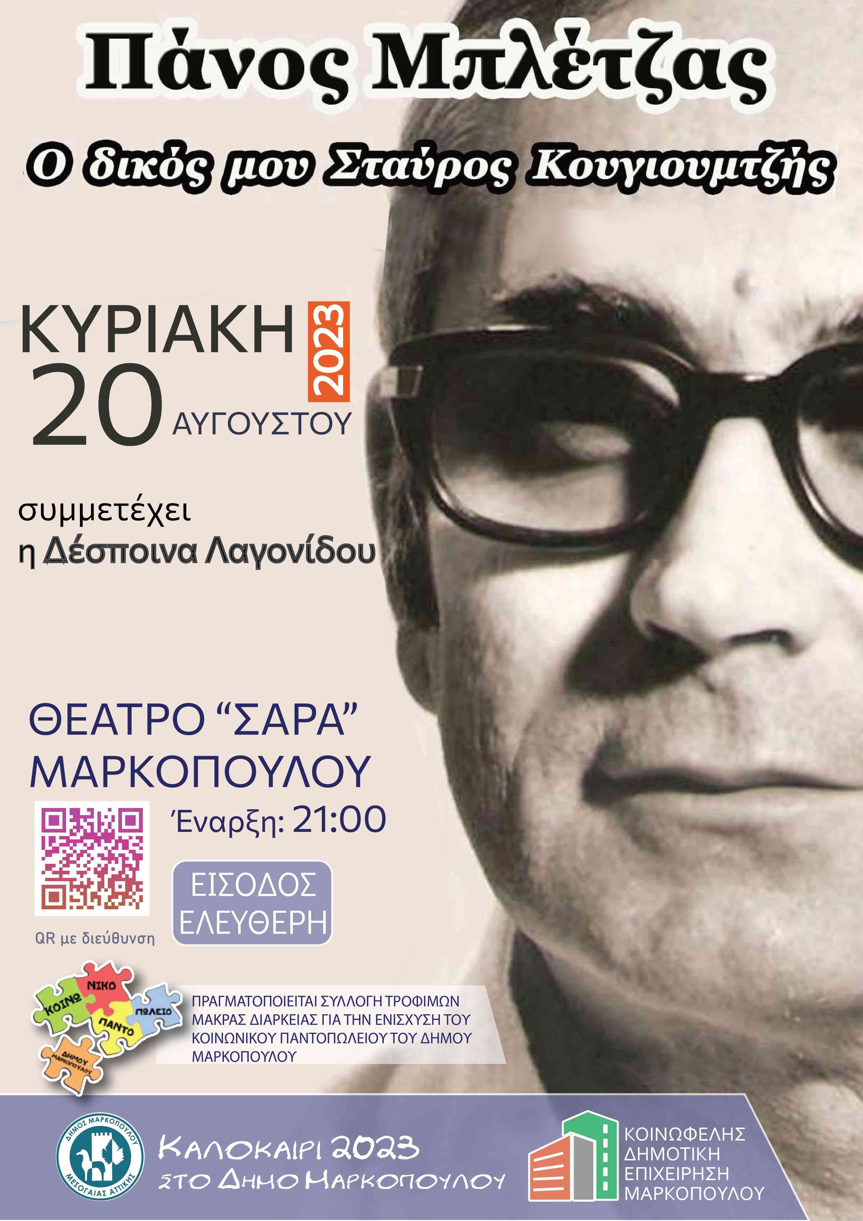 Ο Δήμος Μαρκοπούλου και η Κοινωφελής Δημοτική Επιχείρηση Μαρκοπούλου, σας προσκαλούν την Κυριακή 20 Αυγούστου 2023 και ώρα 21.00 στο ανοιχτό Θέατρο Σάρα Μαρκοπούλου, για να απολαύσουμε όλοι μαζί, το μουσικό αφιέρωμα στο έργο του σπουδαίου συνθέτη Σταύρου Κουγιουμτζή.