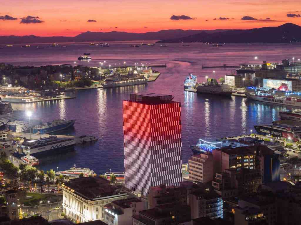 Πρόβες φωταγώγησης του Πύργου του Πειραιά, η οποία θα γίνει στις 14 Δεκεμβρίου. Εντυπωσιακές εικόνες με αντικατοπτρισμό στα νερα του λιμανιού του Πειραιά, του μεγάλου λιμανιού της Ελλάδας.