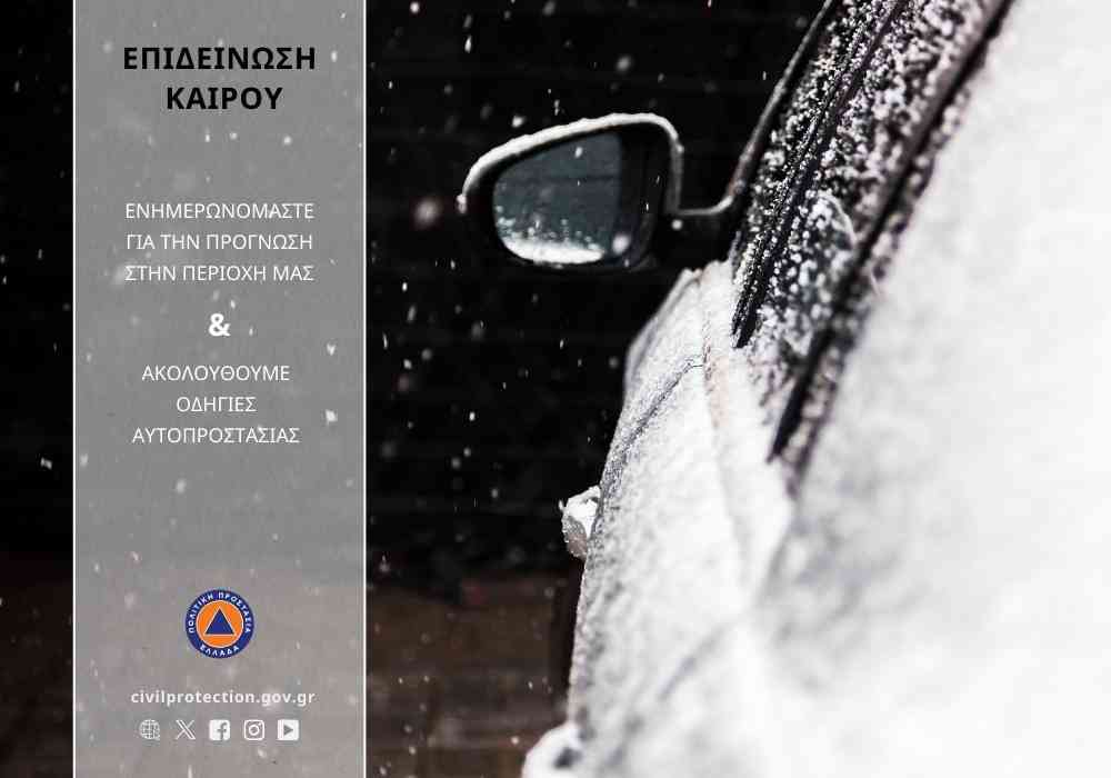 α) Από τις πρωινές ώρες της Κυριακής (28-01-24) στα ορεινά της Μακεδονίας και της Θράκης, της Θεσσαλίας, της κεντρικής και ανατολικής Στερεάς, της Εύβοιας και της Πελοποννήσου ενώ τις μεσημβρινές – απογευματινές ώρες θα χιονίσει και σε ορεινές περιοχές της Κρήτης.