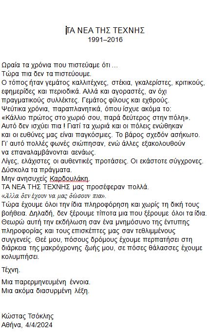 «Τα Νέα της Τέχνης» μας προσέφεραν πολλά. «Άλλα δεν έχουν να μας δώσουν πια». Τώρα έχουμε όλοι την ίδια πληροφόρηση και χωρίς την δική τους βοήθεια. Δηλαδή δεν ξέρουμε τίποτα, μια που ξέρουμε όλοι τα ίδια.