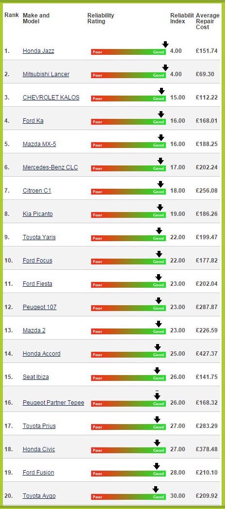 Η Βρετανική Reability Index με τη μεγάλη βάση δεδομένων άνω των 50.000 οχημάτων, ανακοινώνει τα πιο αξιόπιστα αυτοκίνητα για την αγορά της Μ. Βρετανίας, τα οποία υπολογίζονται με βάση τον αριθμό βλαβών, το κόστος επισκευής, την ηλικία του οχήματος, τα διανυθέντα χιλιόμετρα και το μέσο χρόνο ακινησίας από τις βλάβες.